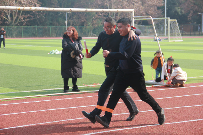 不久由于求胜心切,各个赛道上就呈现出一派热闹欢腾的景象:有的腿开始“打架”,有的拉扯得跑不了了干脆停下来慢慢走,有的索性直接改跑为跳,还有的跑着跑着摔翻在地,洋态可憨掬···两旁的啦啦队连“加油”都顾不上喊了,笑得前仰后合,泪花都快出来了。 虽然是一片喜庆、洋态百出,但是各支队伍还是慢慢找出了默契,无论是摔倒还是用别出心裁的方式“跑”,大家始终怀着强烈的集体荣誉感,相互鼓励着、搀扶着跑完全程!