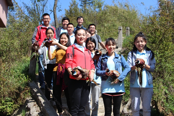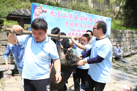 4月29日一早大家便开启了九黄山之旅,体验了登山、滑草、狩猎等特色项目。一路上大伙儿热情高涨,认真体会大自然带给我们发自内心的喜悦,山间不时传来合唱的歌声,仿佛回到了无忧无虑的童年。经过2小时的辛勤攀登,挥洒着汗水,抵达后山滑草场,大家有的抓野鸡,有的滑草,有的观看猴子和小熊表演,热闹非凡。不多时,大家便捕获了6只野鸡,得意满满的快乐慕煞过往游客!随后,大家集体前往期待已久的野生动物狩猎场,开始了惊险刺激的徒手抓野猪活动。莽莽丛林,荆棘密布,万余亩的茫茫大山,挡不住我们30多位须眉巾帼的豪情壮志,漫山遍野回荡着小伙子姑娘们的呐喊声欢呼声。终于,大家通过层层堵截、包围,甚至叠罗汉的方式,成功捕获了一头重达118斤的黑毛野猪----最佳战利品,也是该狩猎场开春以来唯一游客徒手捕获的野猪!在这个活动中,充分体现了团队协作的重要性,更展现了金宝慱亚洲体育团队的勇敢、无所畏惧的英雄本色!